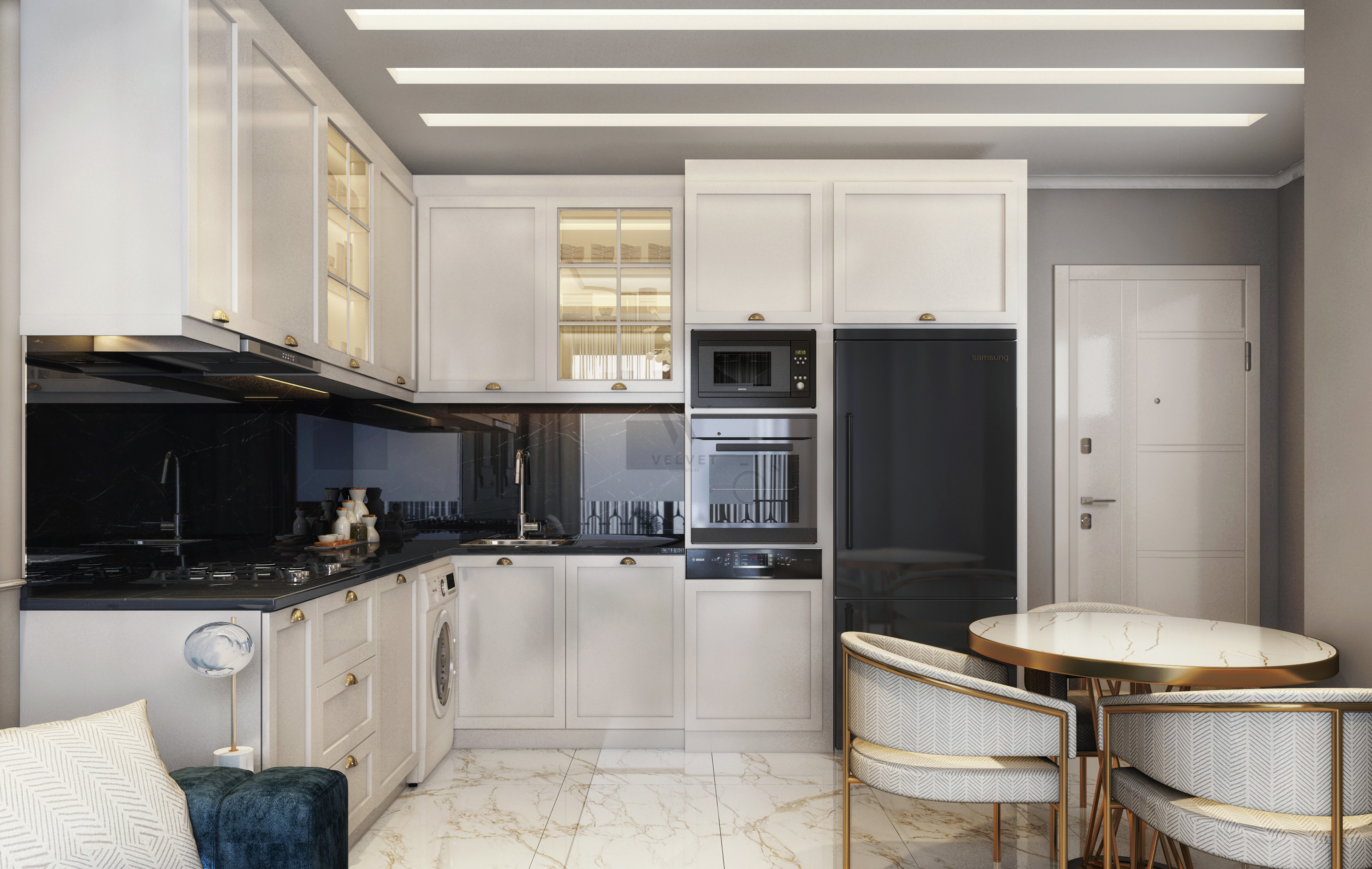 Полы из гранита 60x120, лакированные кухонные шкафы, кухонные столешницы из гранита Black Star Galaxi, изолированные и изолированные столярные изделия, двойные защитные очки, стальная дверь особого дизайна, внутренние двери особого дизайна, окрашенные лаком, душевая кабина из закаленного стекла, раковина для ванной комнаты Hilton