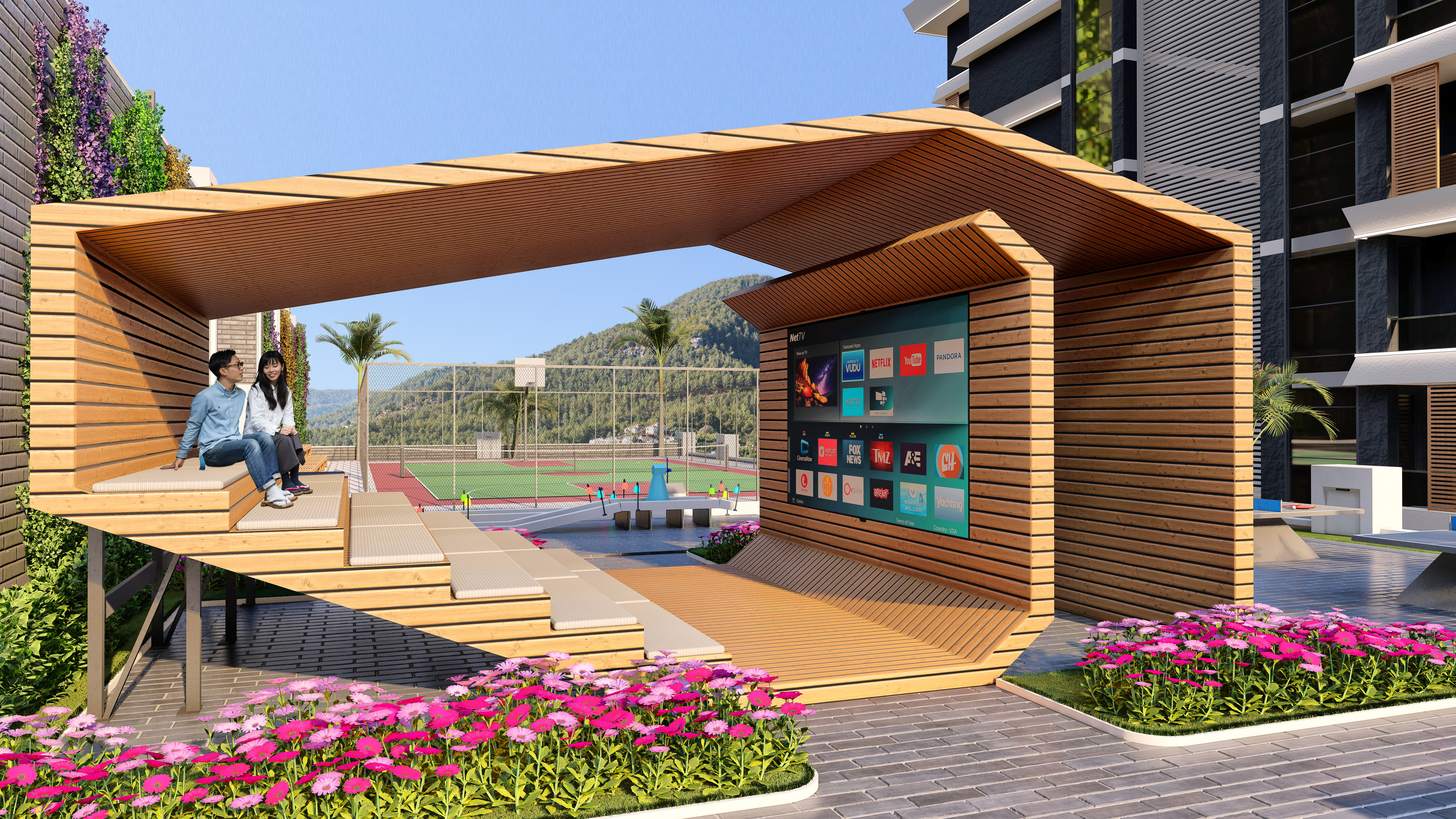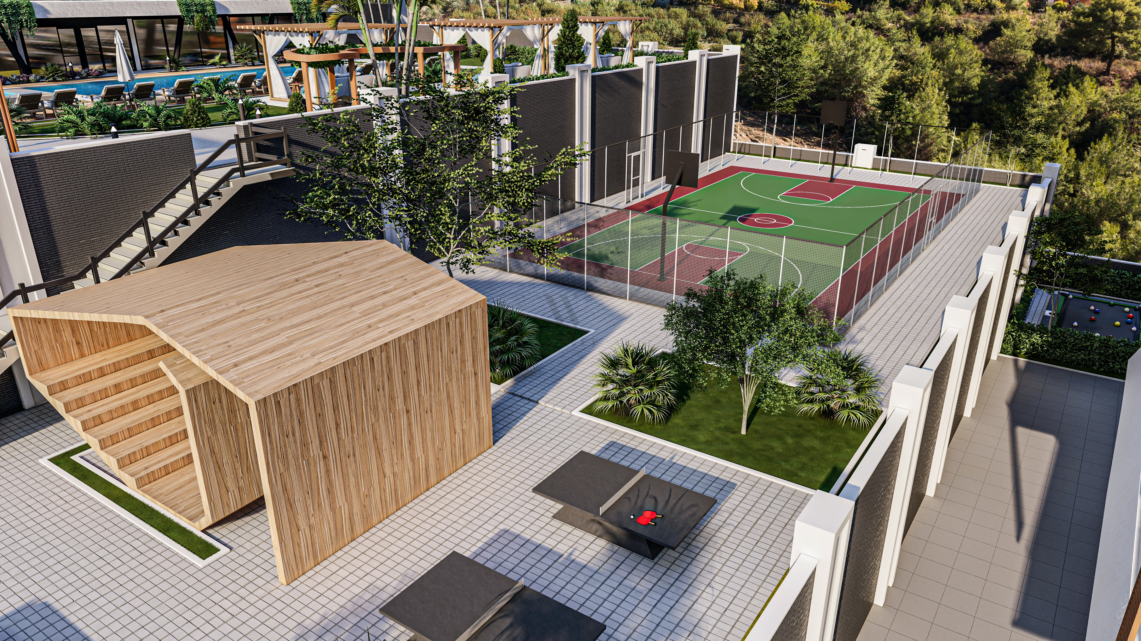 Парковка, теннисный корт, баскетбольная площадка, открытая терраса, два бассейна (160 и 100 м2), шезлонги и места для отдыха у бассейна, бар у бассейна, кинотеатр под открытым небом, настольный теннис, мини-гольф, современные зоны барбекю, детская площадка, прогулки трасса, круглосуточная охрана