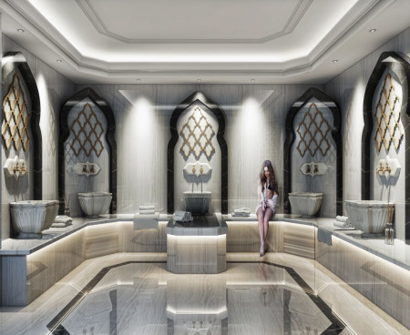 Рецепция, спа-центр, мужская и женская раздевалки, сауна, паровая баня, джакузи, турецкая баня, комната отдыха, массажные кабинеты, крытый бассейн, фитнес-центр, игровая комната, детская игровая комната, кафетерий.