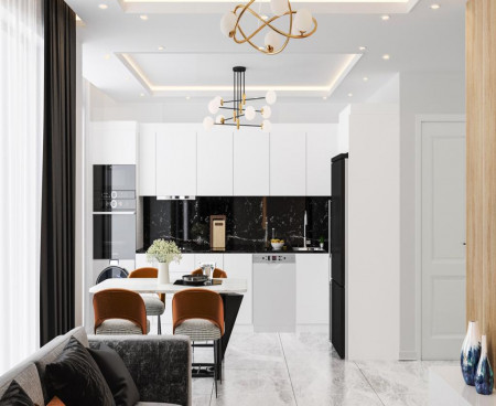 Керамические полы, стальные двери, лакированные кухонные шкафы, точечное освещение, двери и окна из ПВХ, душевые кабины из небьющегося стекла, раковины hilton, моющаяся внутренняя краска для стен, высота потолков 2,90 м.