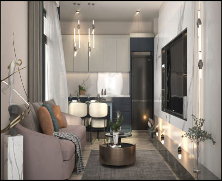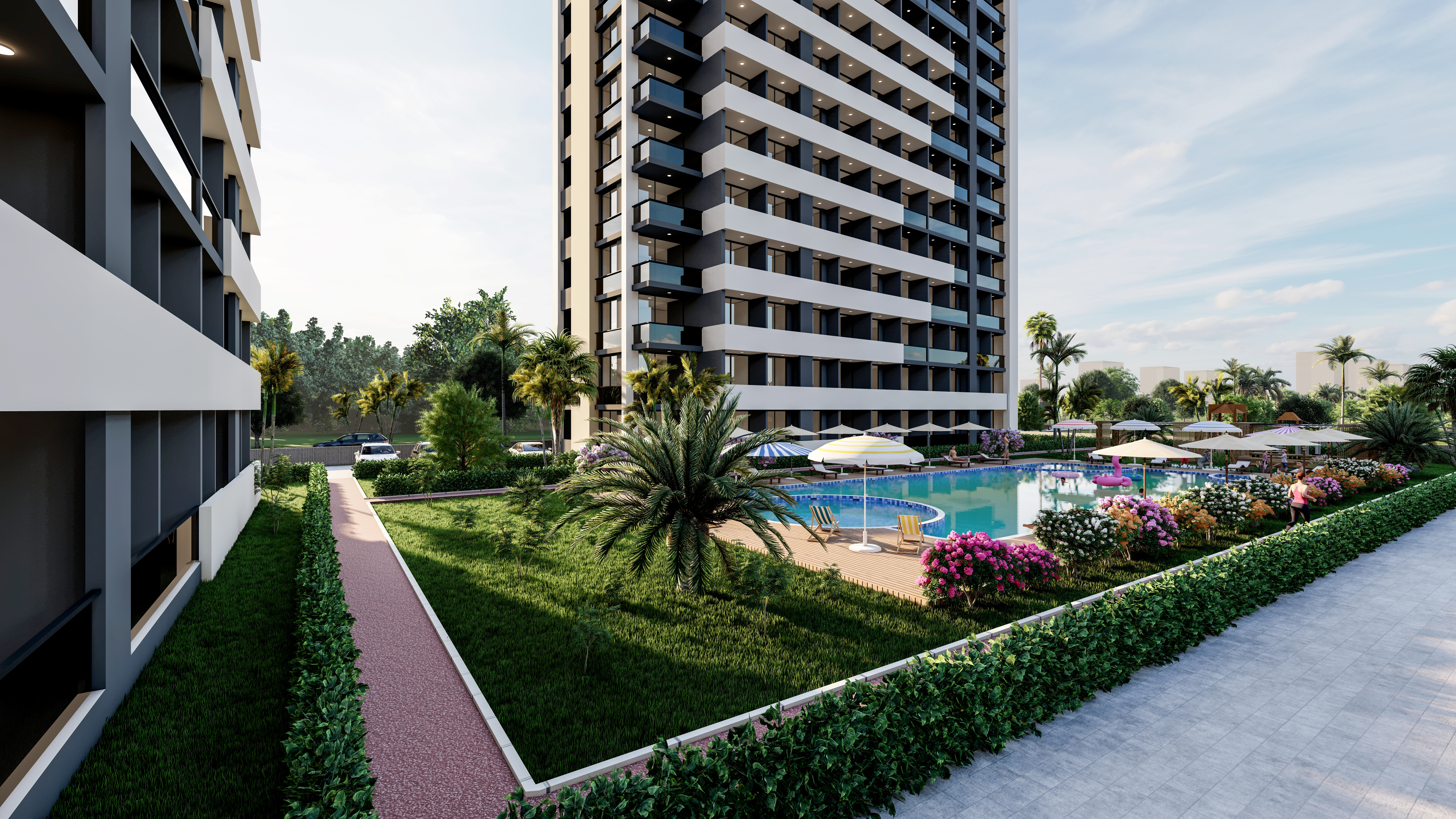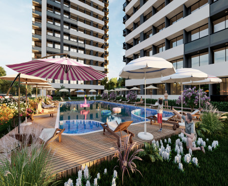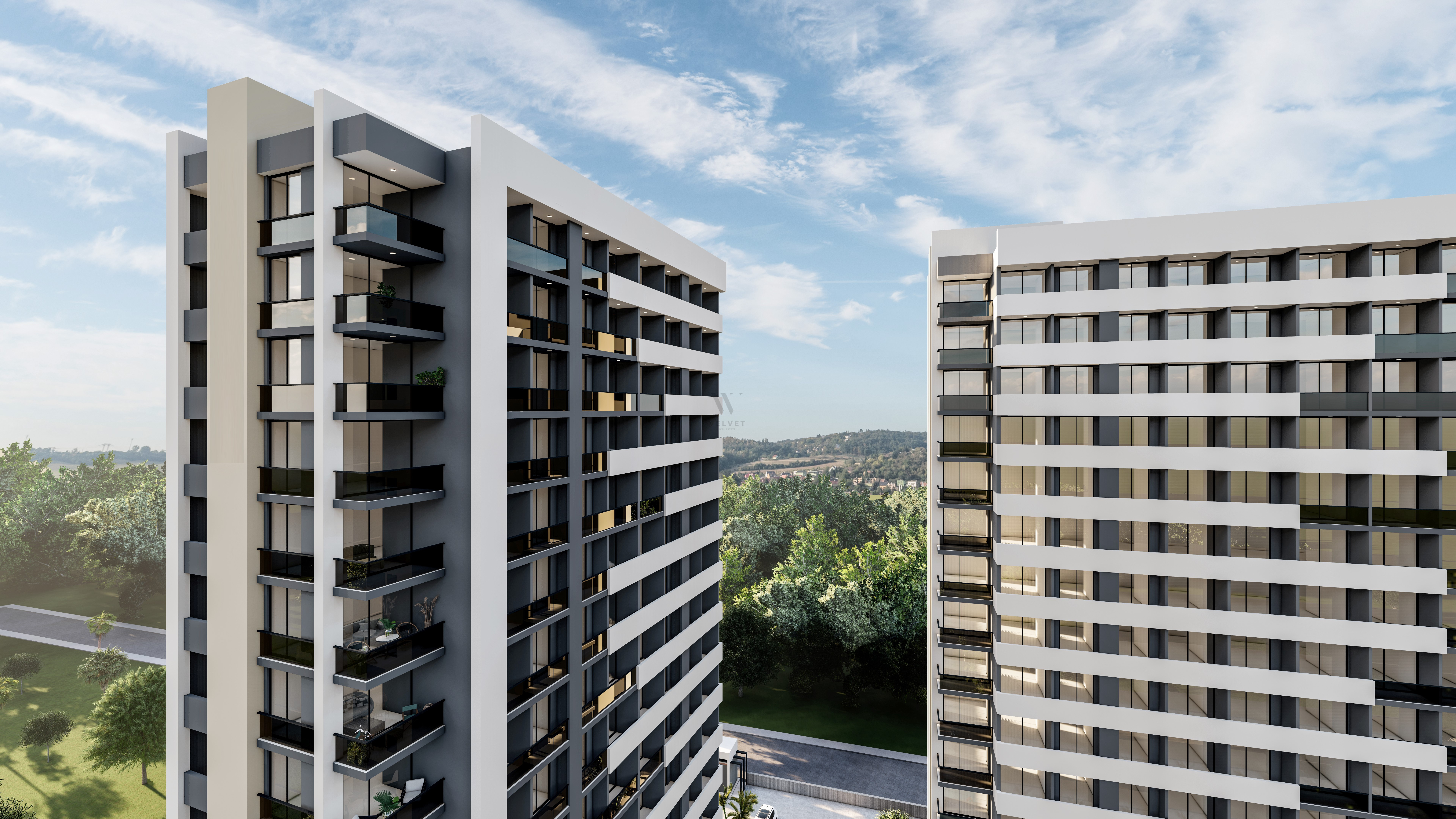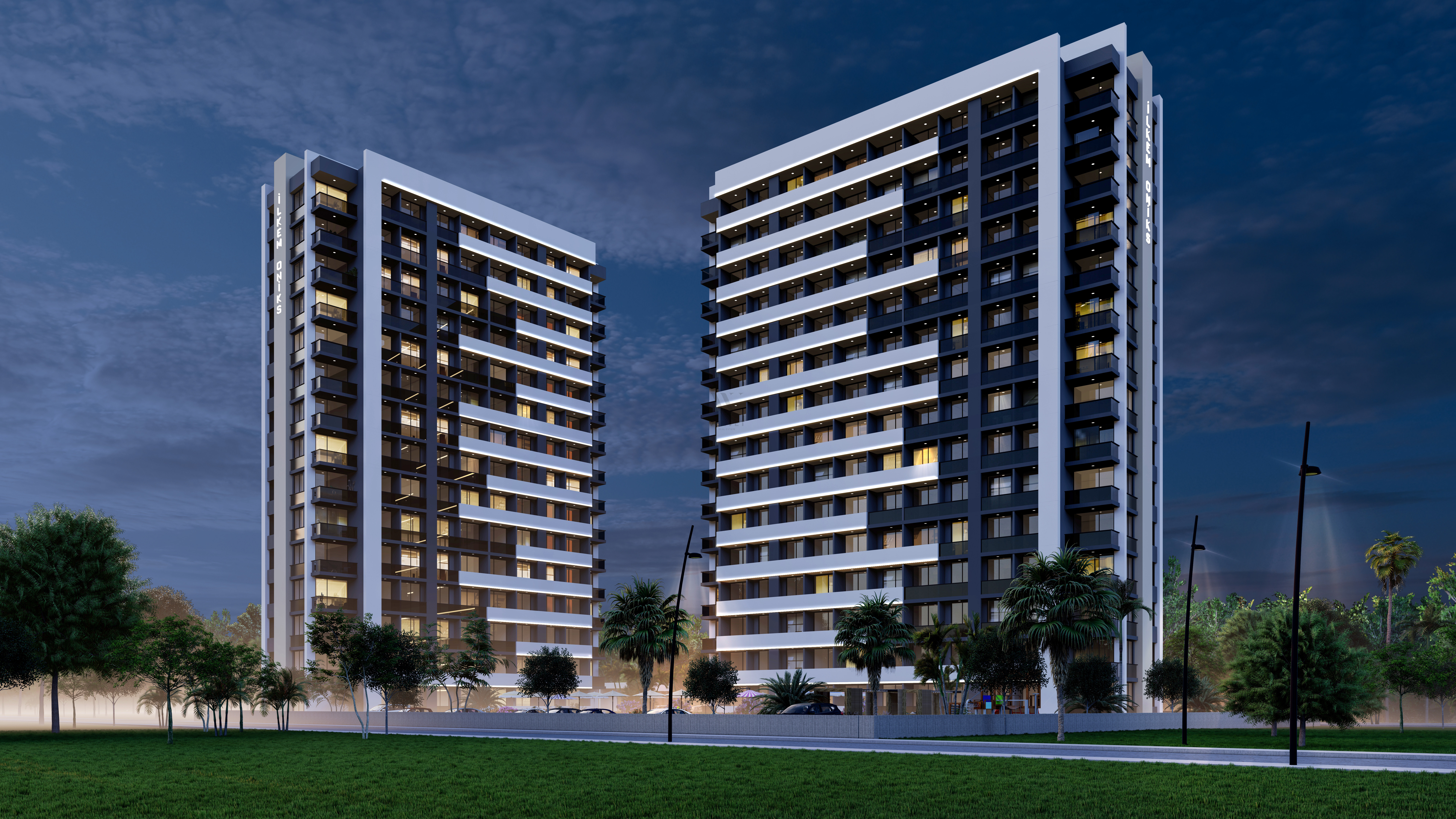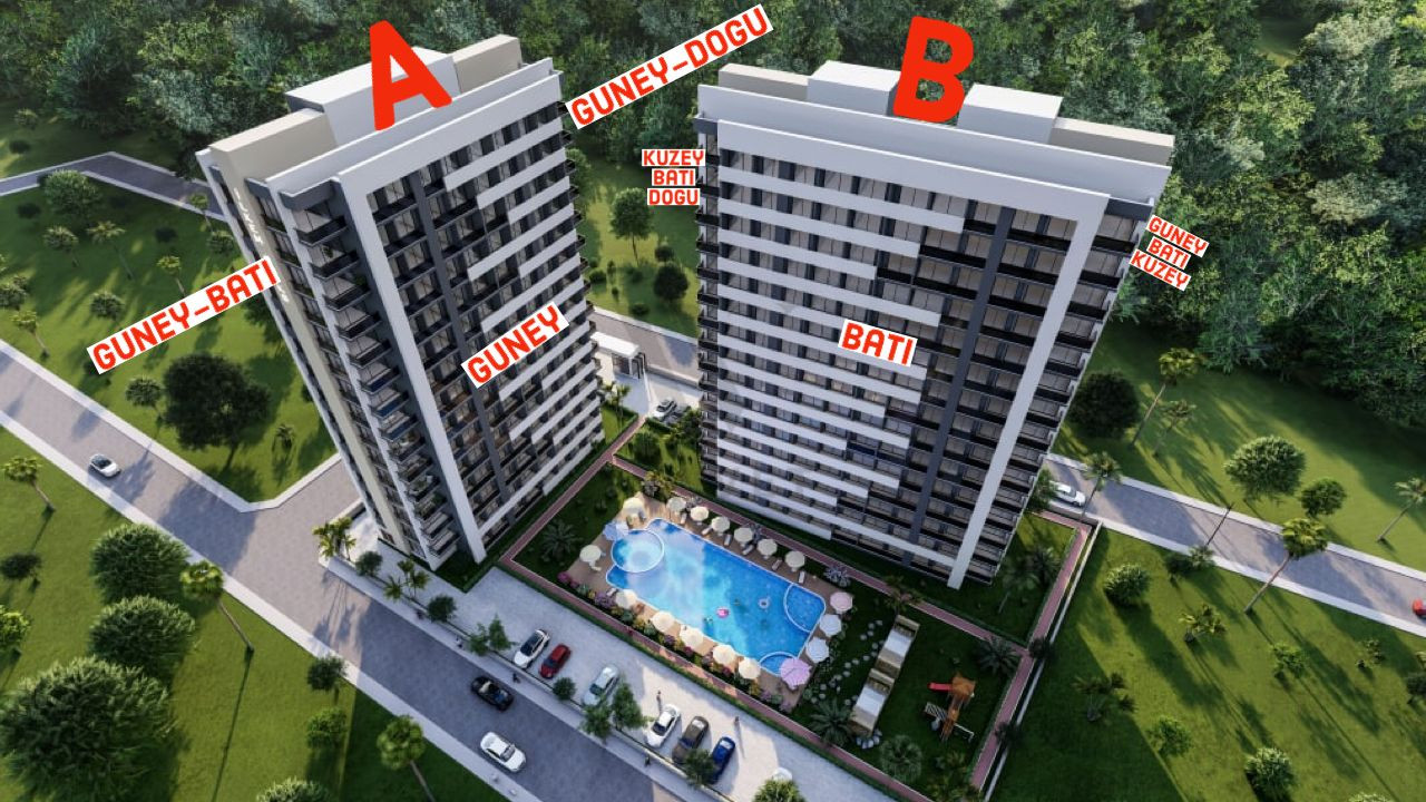 Наш проект, построенный на участке 4.140 м2, состоит из 2-х блоков. В каждом блоке 14 этажей.