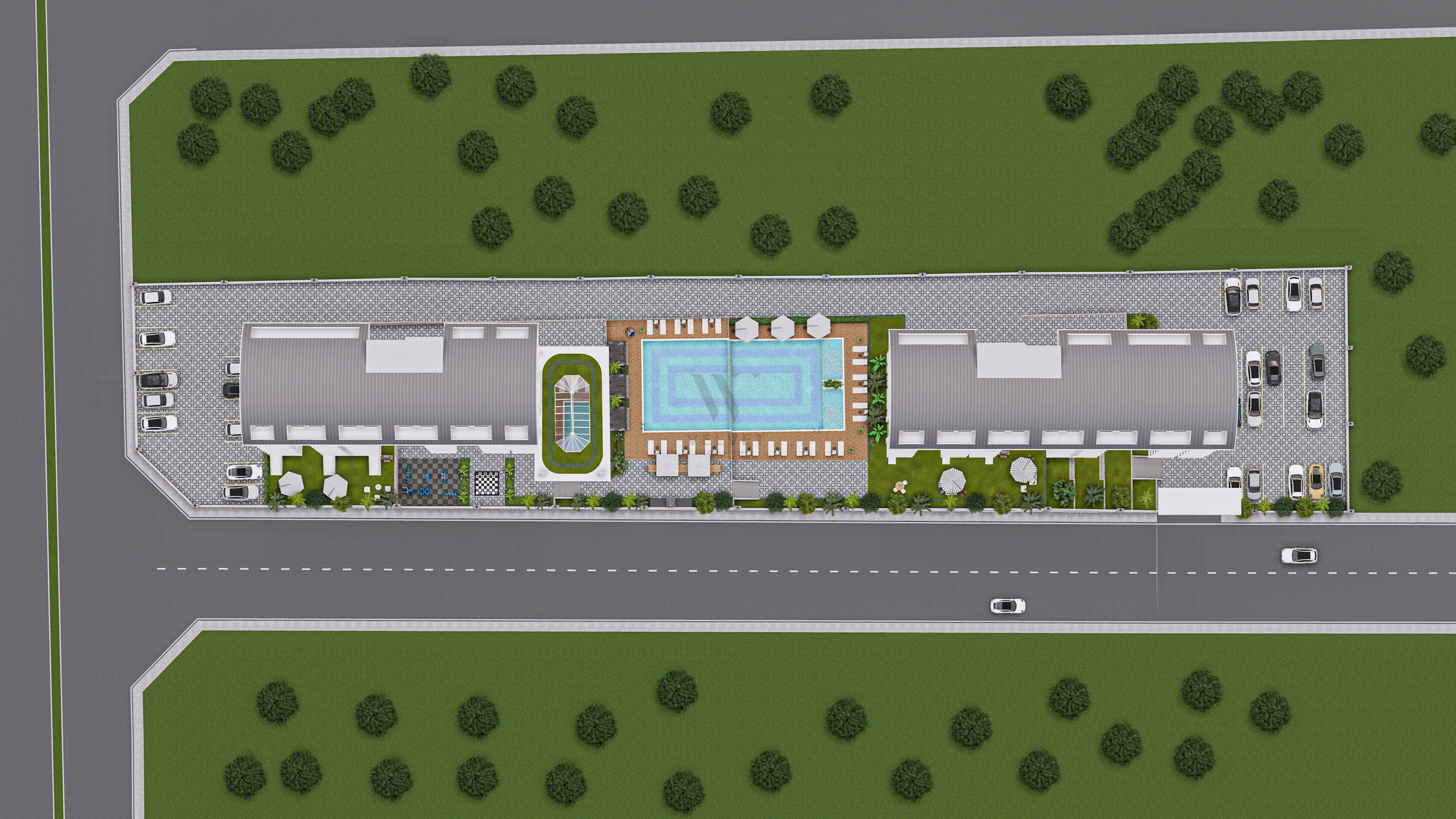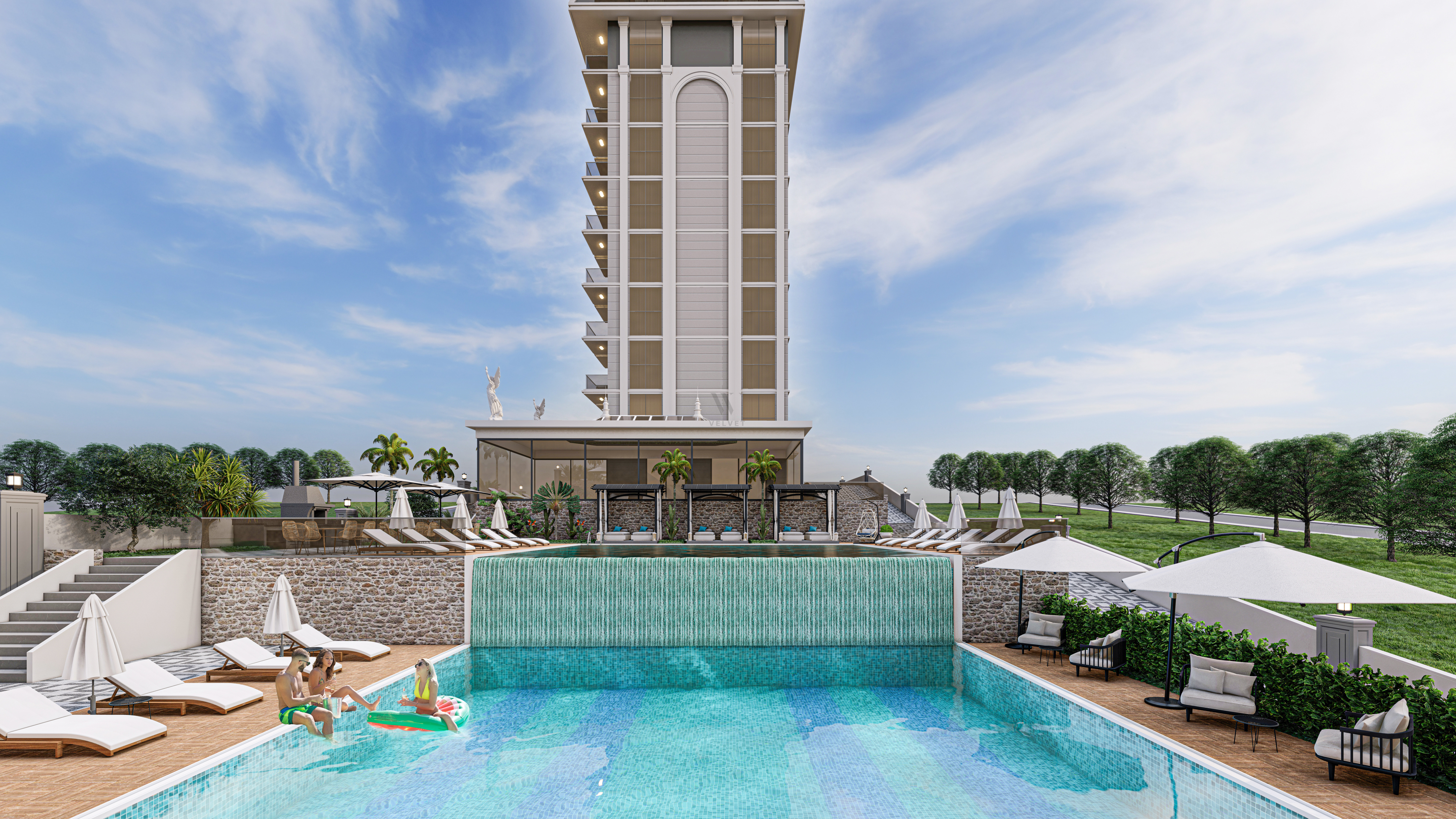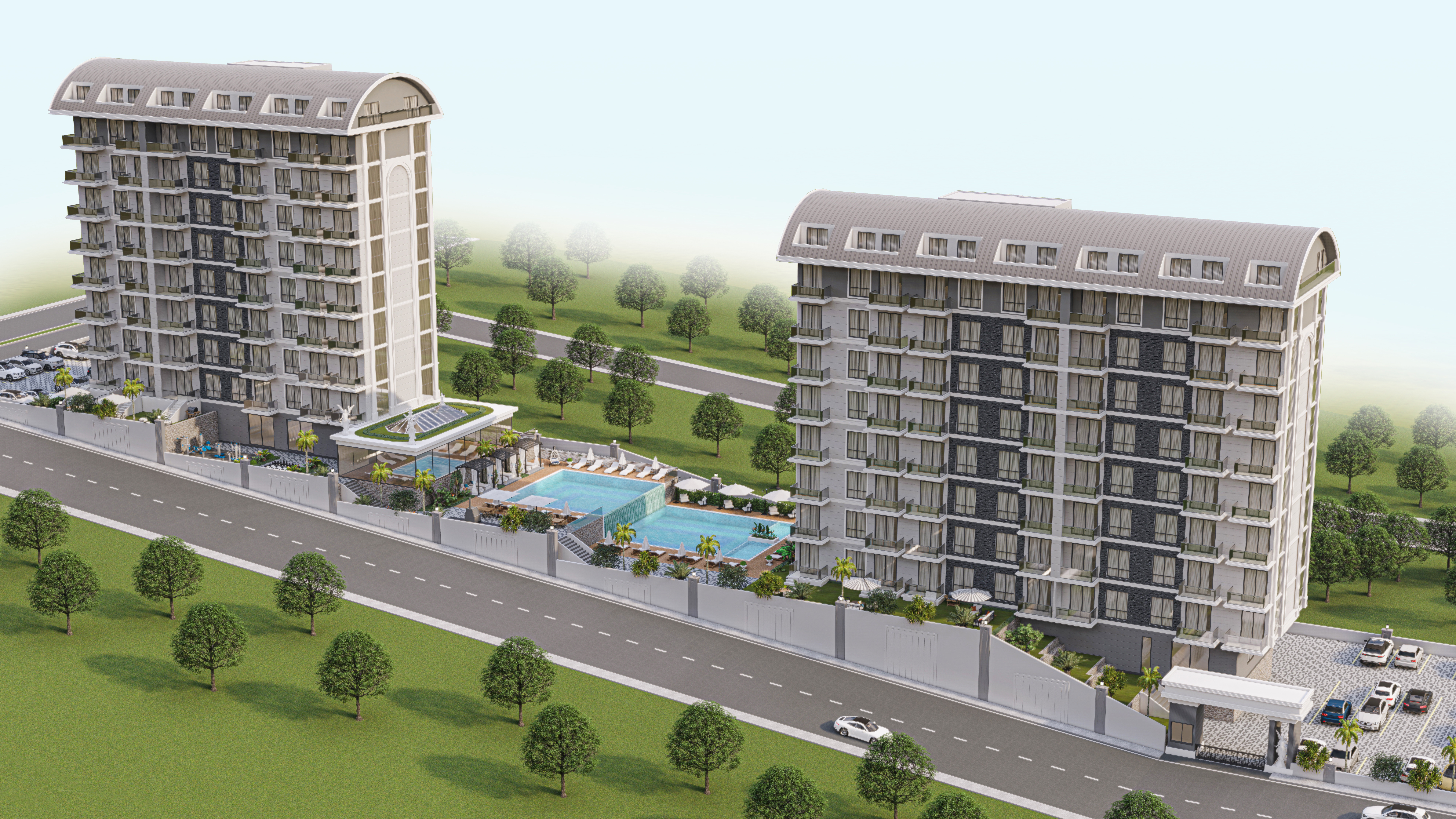 Комплекс построен на прямоугольном участке площадью 4302 м2. Благодаря структуре земель, инфраструктура проекта будет располагаться на террасах между двумя 9-этажными жилыми блоками, в каждом из которых есть отдельный бассейн и зона отдыха.
