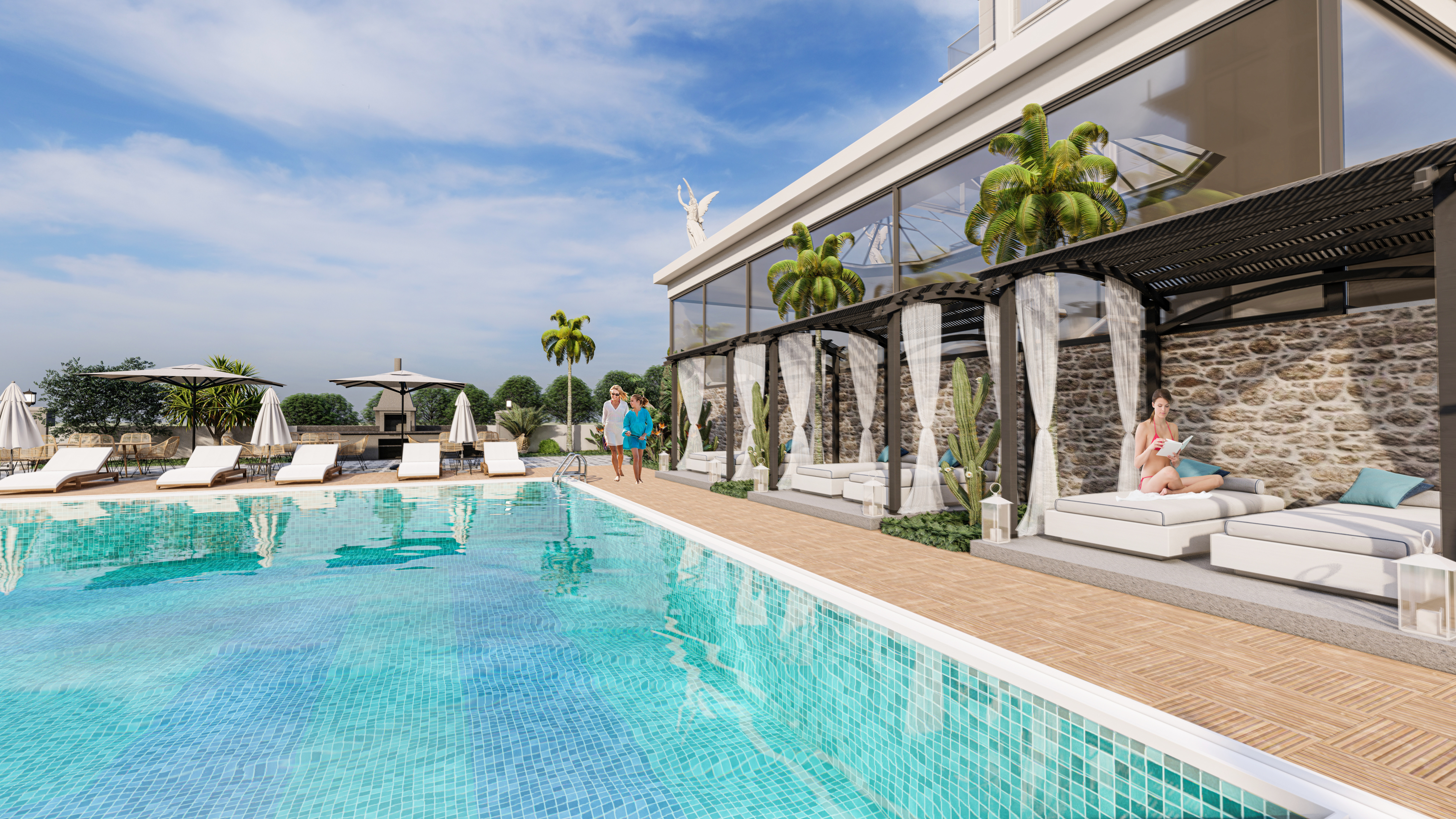 Инфраструктура комплекса включает в себя: открытые бассейны, крытый бассейн, кафе и бар, сауну, турецкую баню, игровую комнату, детскую площадку, тренажерный зал, беспроводной интернет Wi-Fi, спутниковое телевидение, круглосуточную систему видеонаблюдения, генератор.