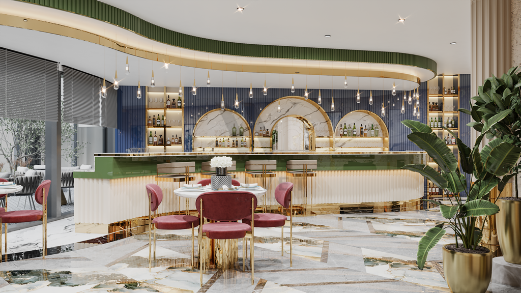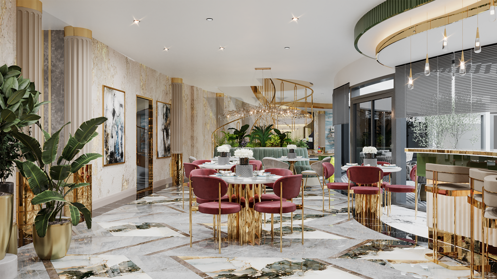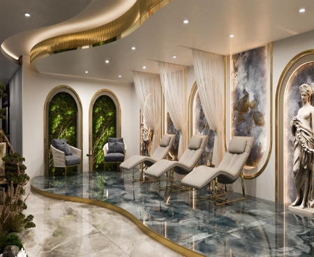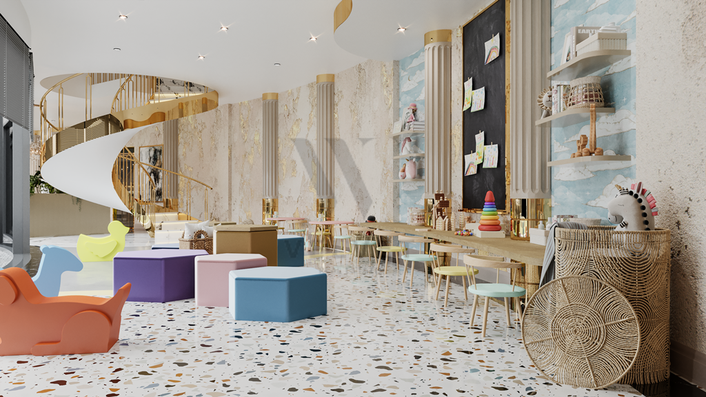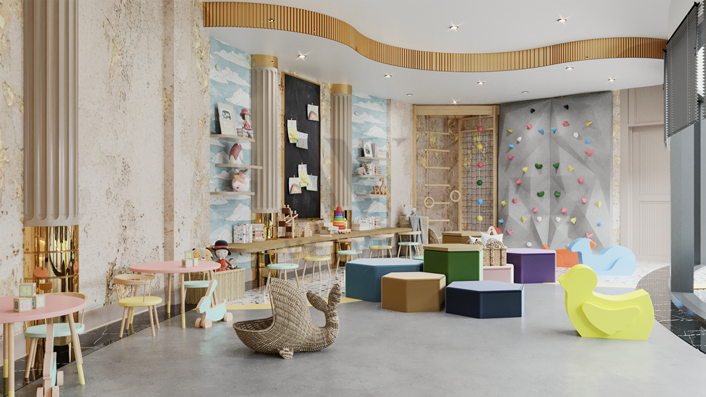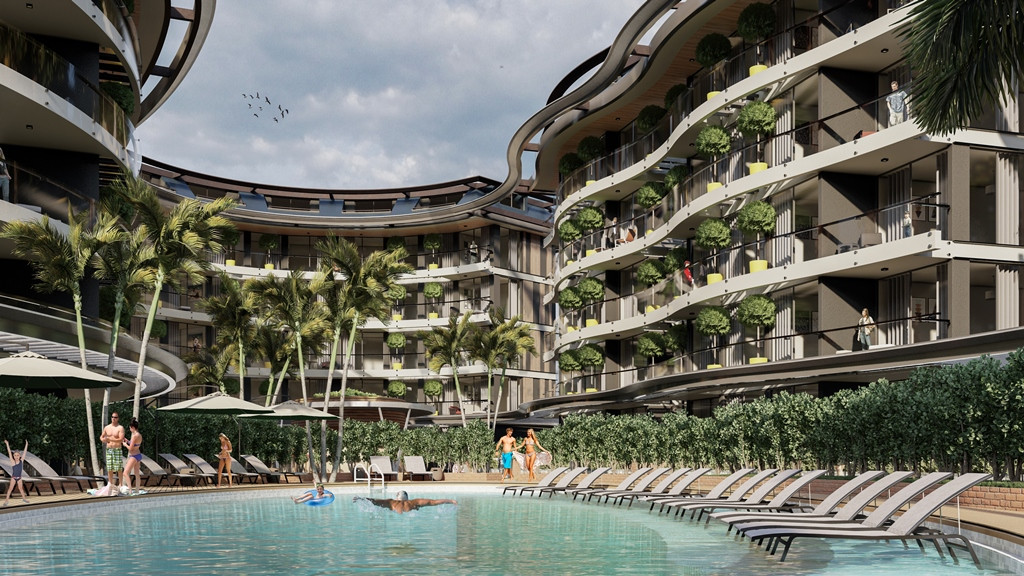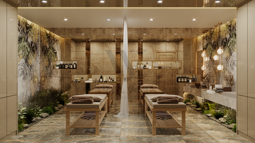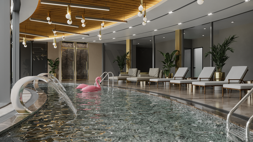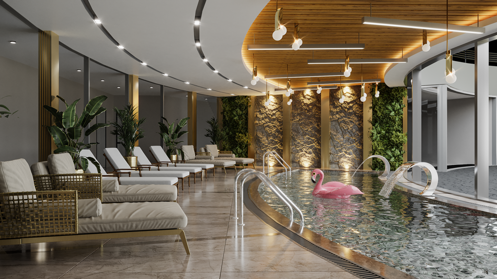 Инфраструктура комплекса: открытый бассейн (440 м2), джакузи, детский бассейн, детская площадка, лобби-кафе (110 м2), СПА (крытый бассейн, хамам, сауна, джакузи, VIP SPA, массажные кабинеты, зона отдыха), тренажерный зал, детская игровая комната, кафе (266 м2),