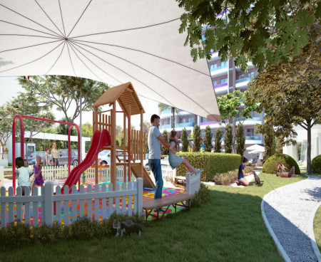 Это жилой центр, где вы будете счастливы жить с площадкой для барбекю, прекрасным зеленым видом и водопадом в саду, полном цветов.