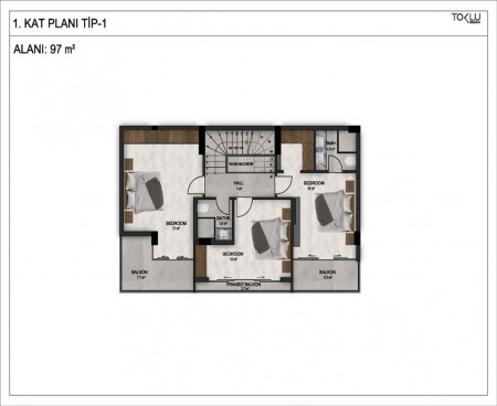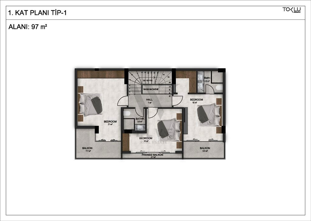 3 + 1 - 157 м2 - 2 ванные комнаты (1 ванная), 1 туалет и 2 балкона на южной стороне.