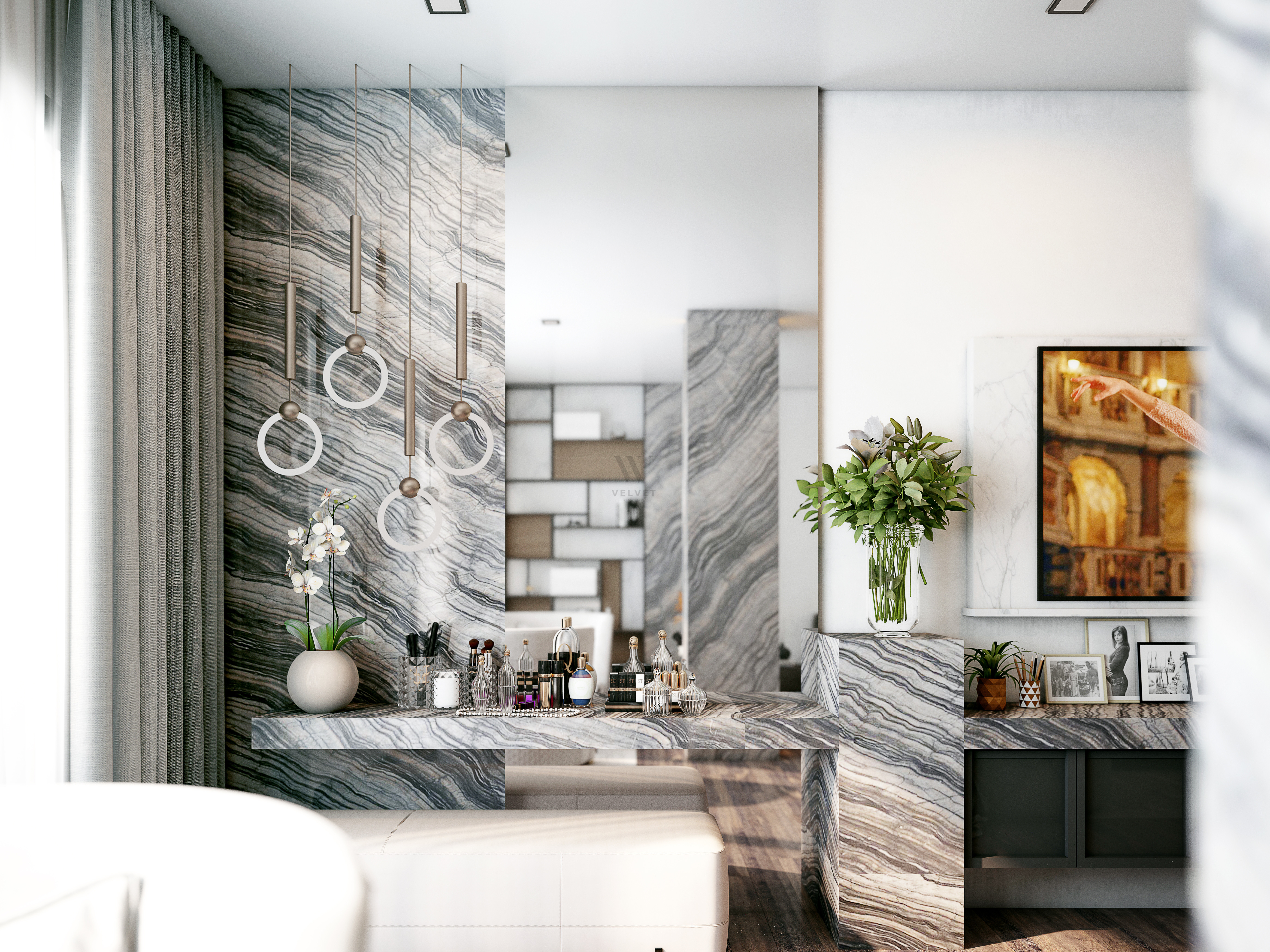 Полы будут выполнены из мрамора и керамики в соответствии с архитектурой.