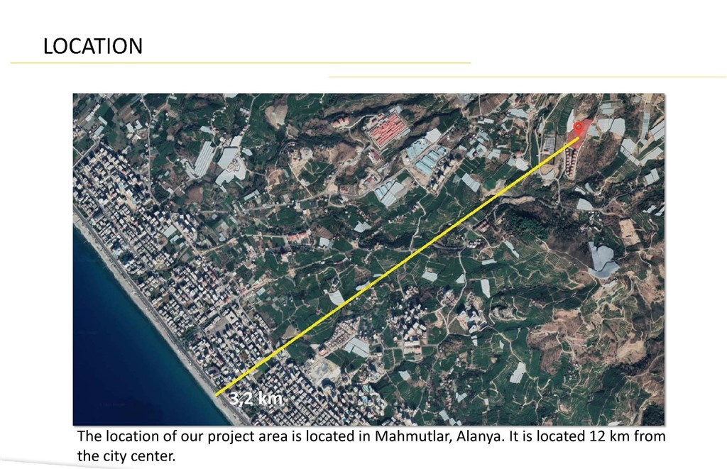 Махмутлар - регион Аланьи, где постоянно проживает большая часть иностранцев, более 1400 семей. В районе есть вся социальная инфраструктура для отдыха и жизни. Комплекс расположен в пригороде Махмутлара, в панорамном месте на холме, с видом на море, лес, горы и город. Чистейший воздух, тишина и спокойствие. Расстояние до моря 3,2 км. Для удобства гостей и жителей будет трансфер к морю. Недалеко от Резиденции, всего в 440 м, находится государственная начальная школа, также рядом две средние школы и даже университет. Все школы забирают и привозят детей домой с помощью специального школьного трансфера. Школа доступна для иностранцев с местом жительства