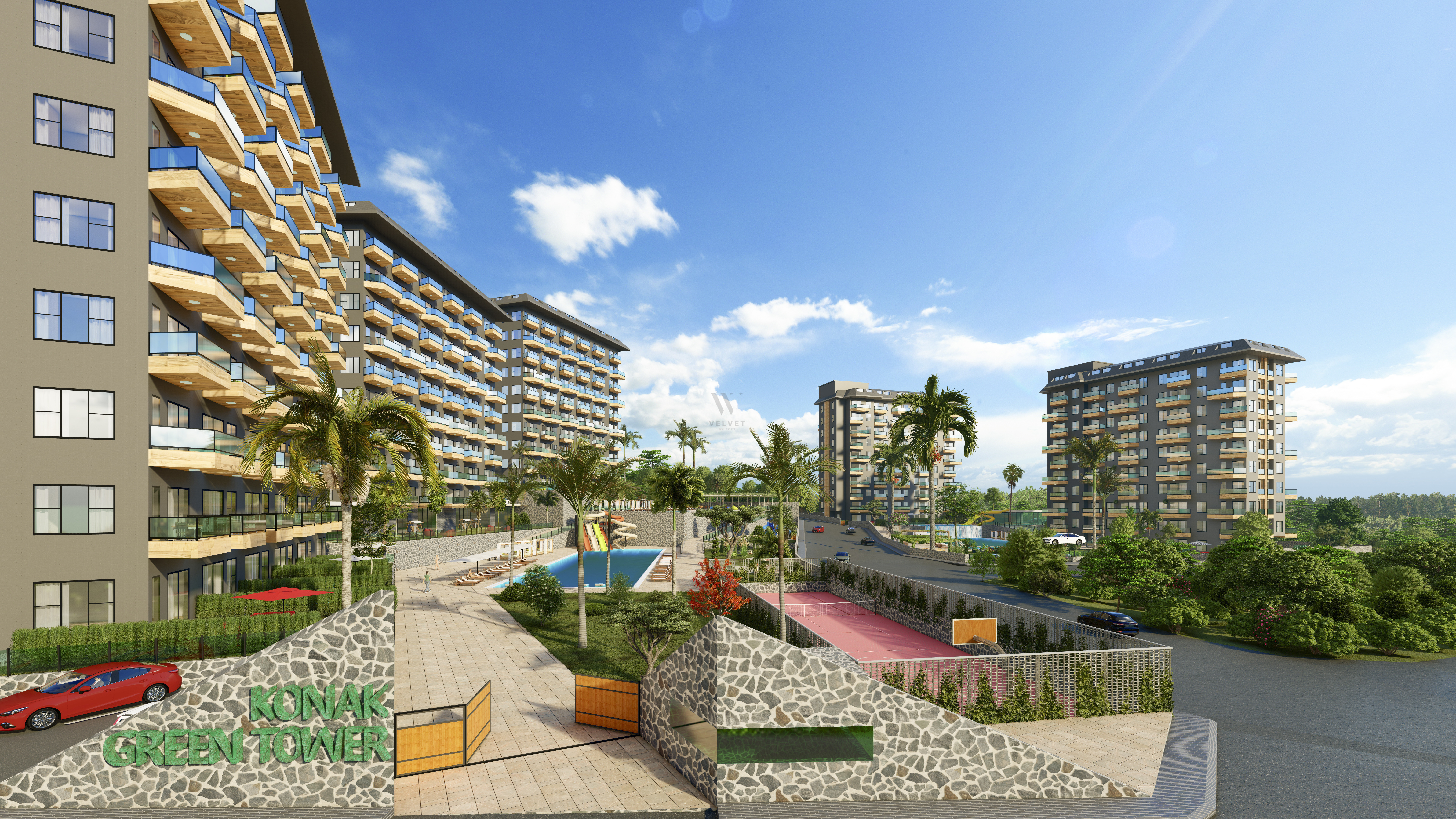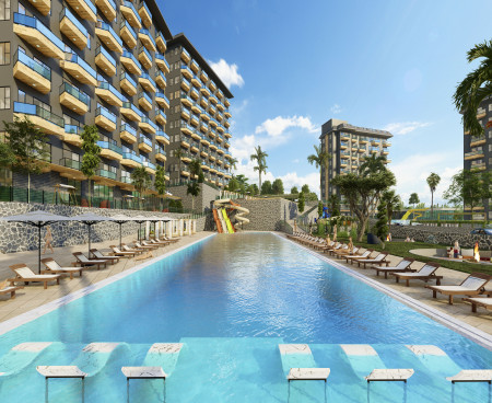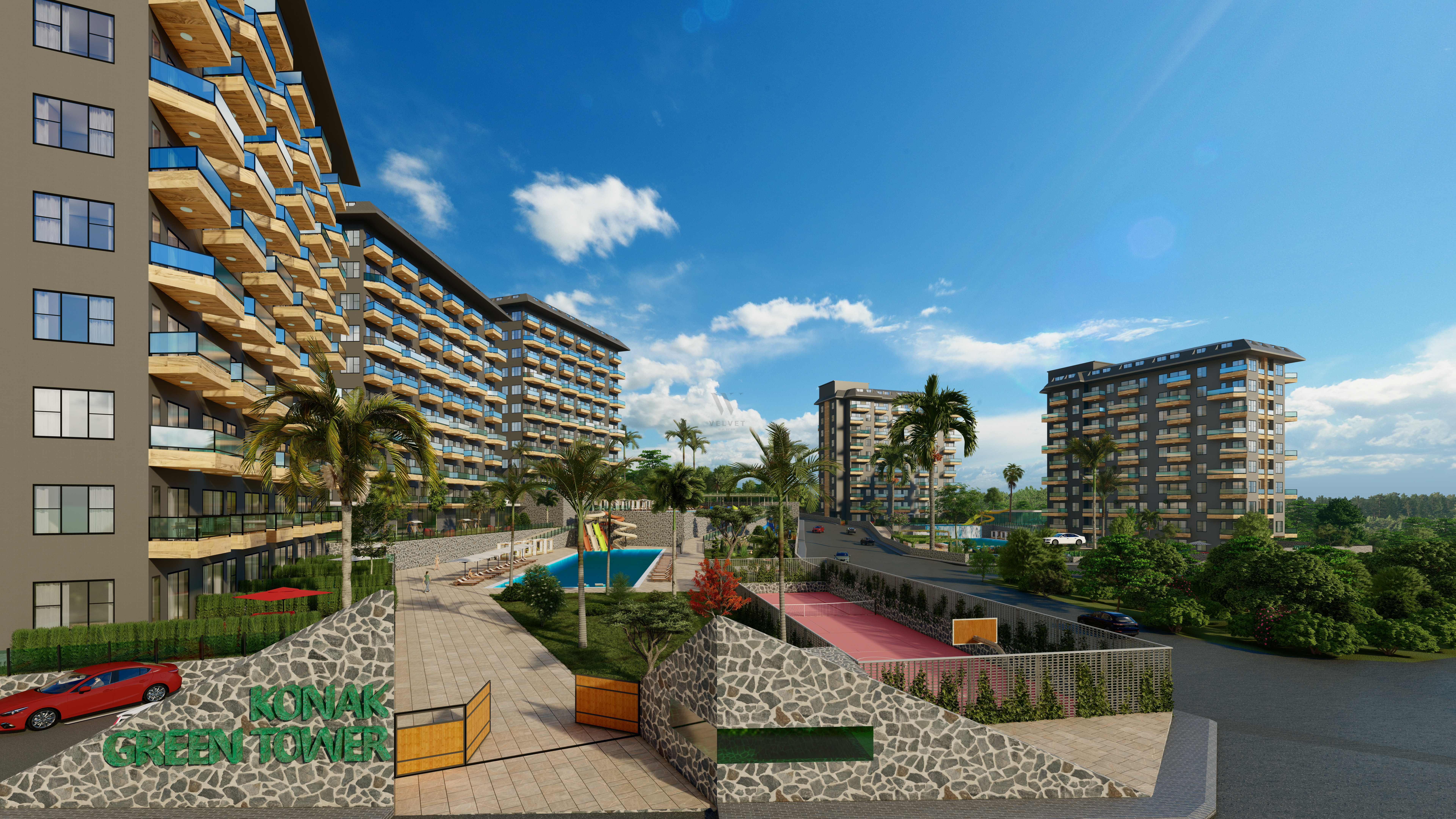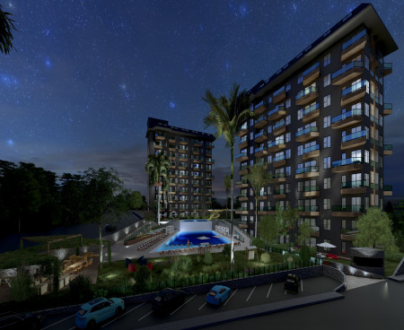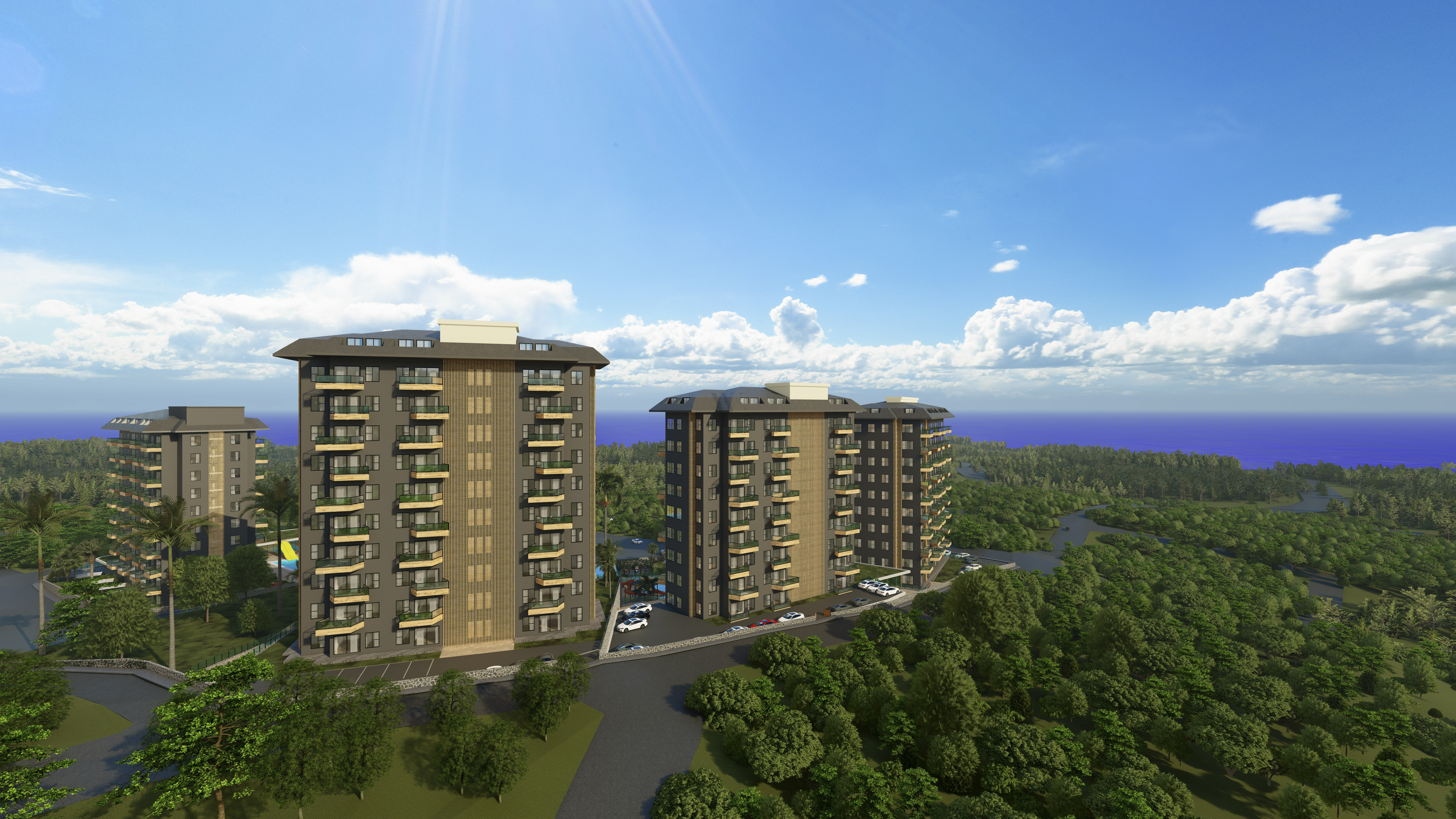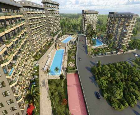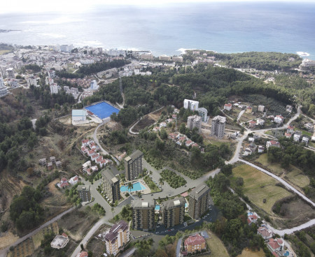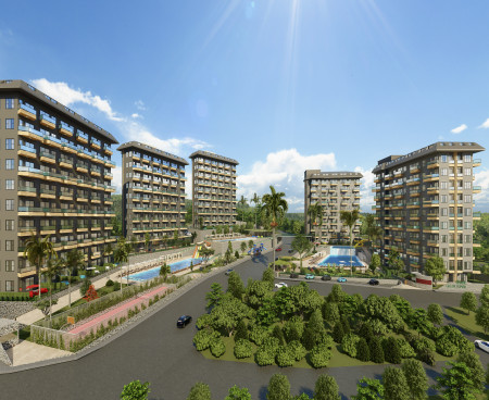 Жилой комплекс строится на участке площадью 7700 м2 и состоит из пяти блоков. Панорамные окна открывают великолепный вид на горы, море и зеленые насаждения.