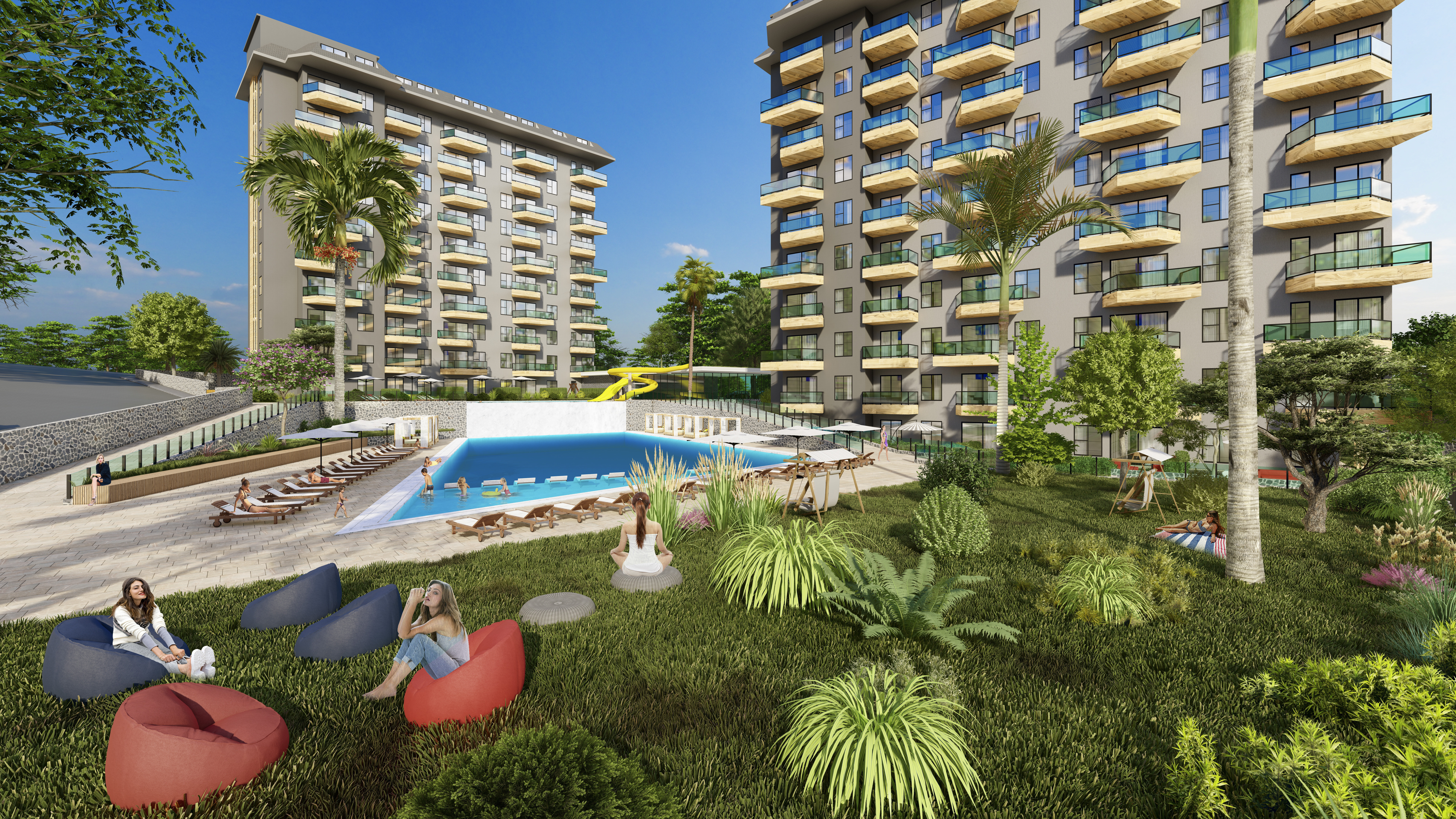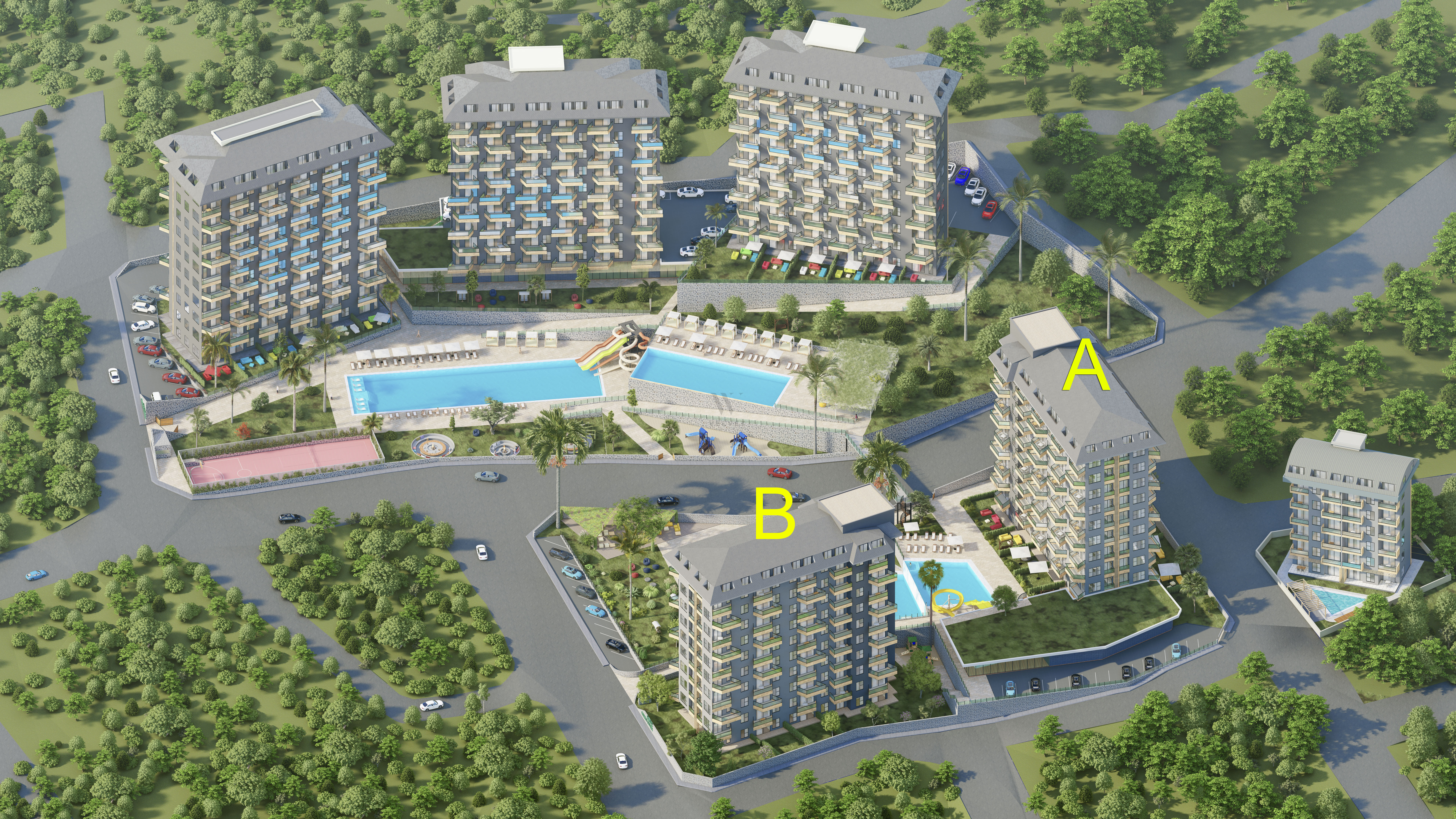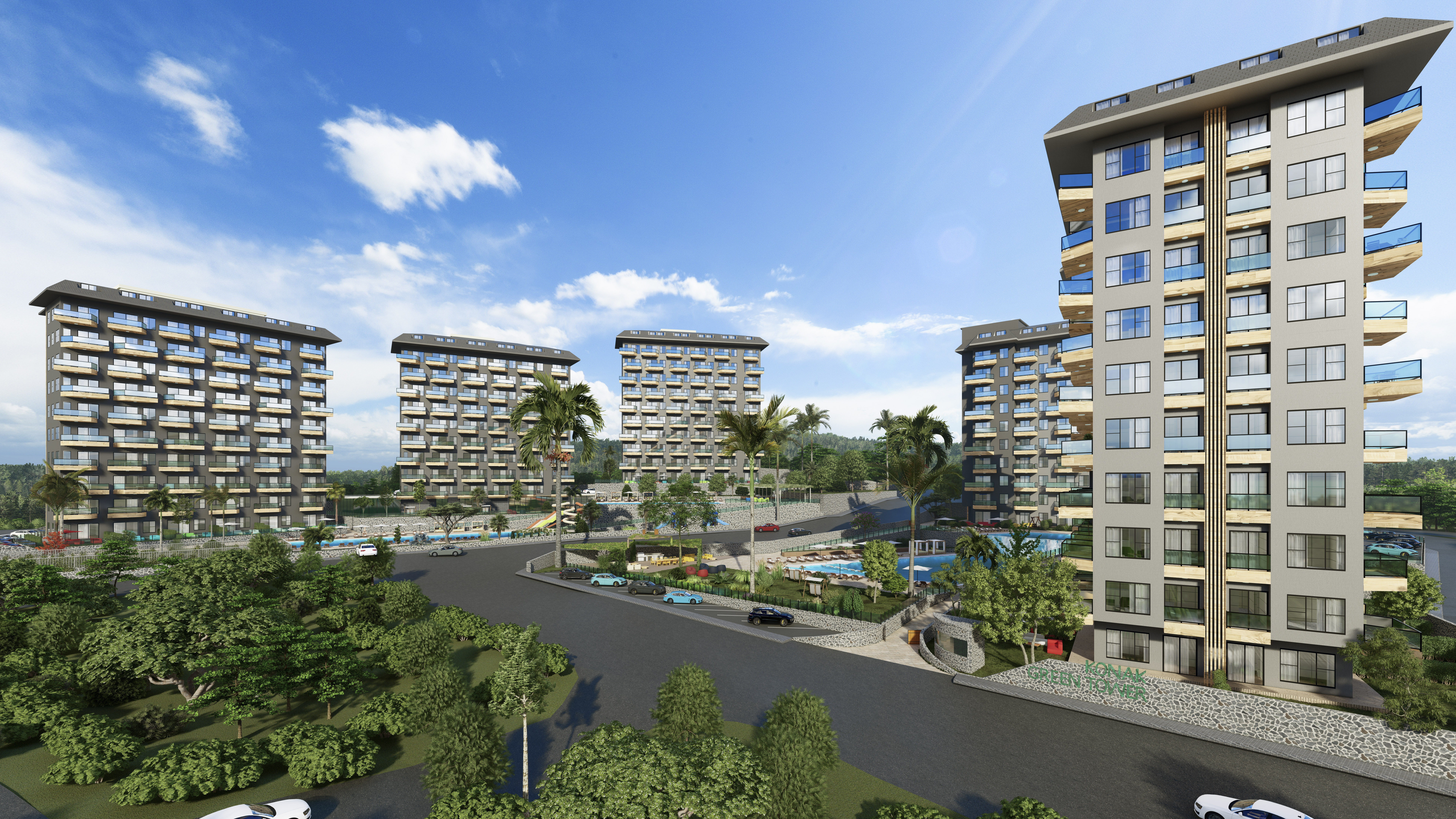 Жилой комплекс строится на участке площадью 7700 м2 и состоит из пяти блоков. Панорамные окна открывают великолепный вид на горы, море и зеленые насаждения.