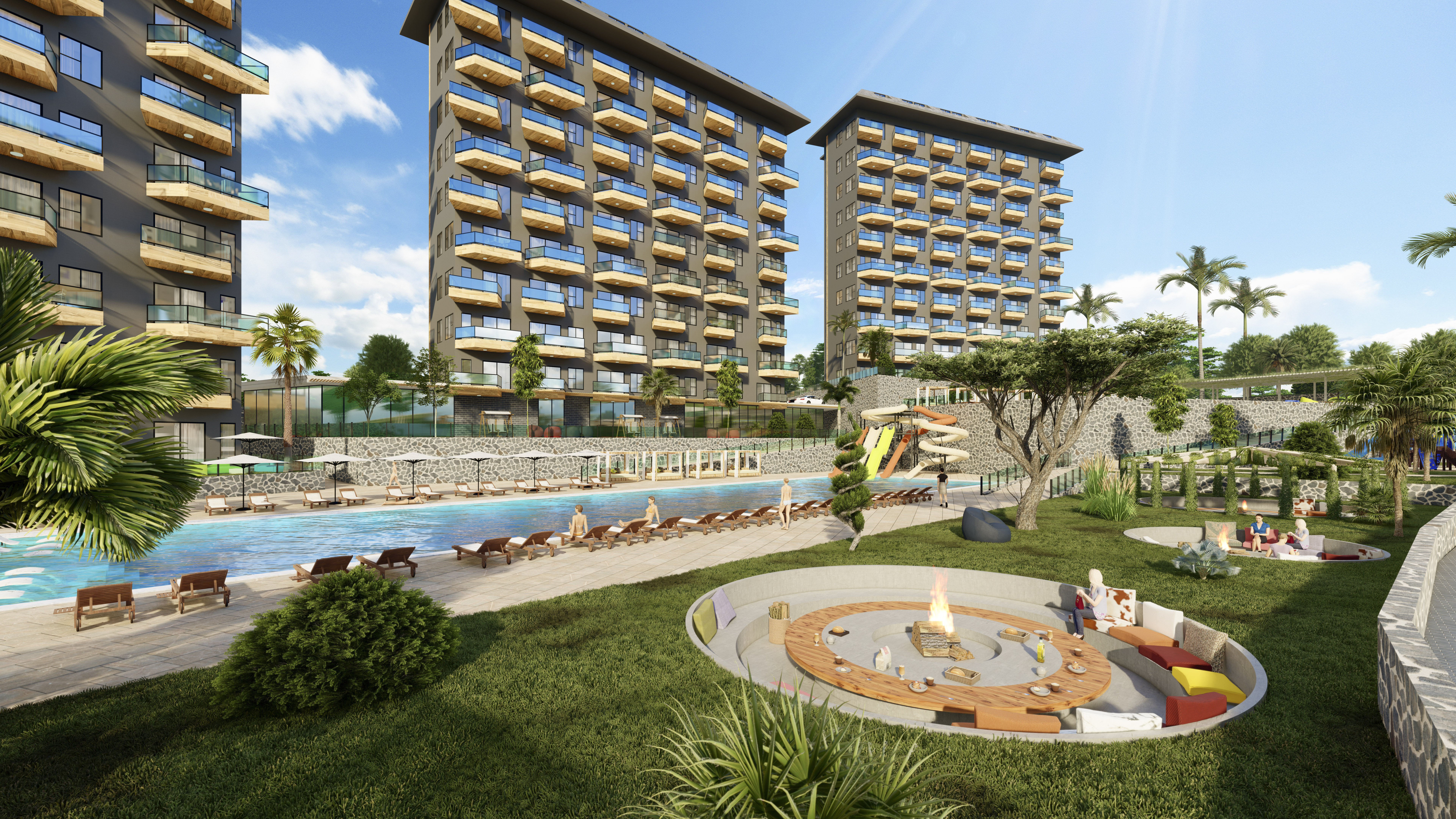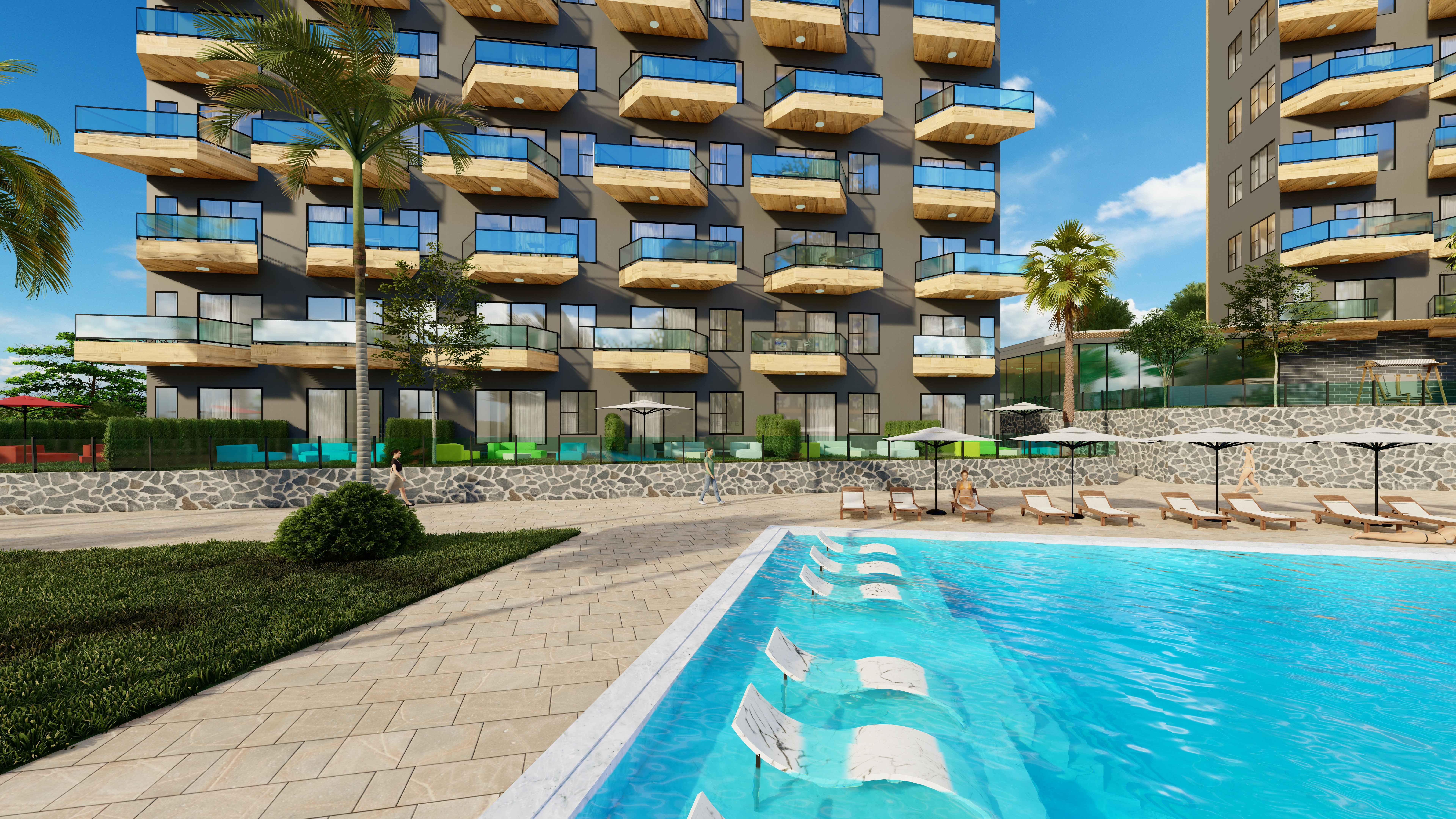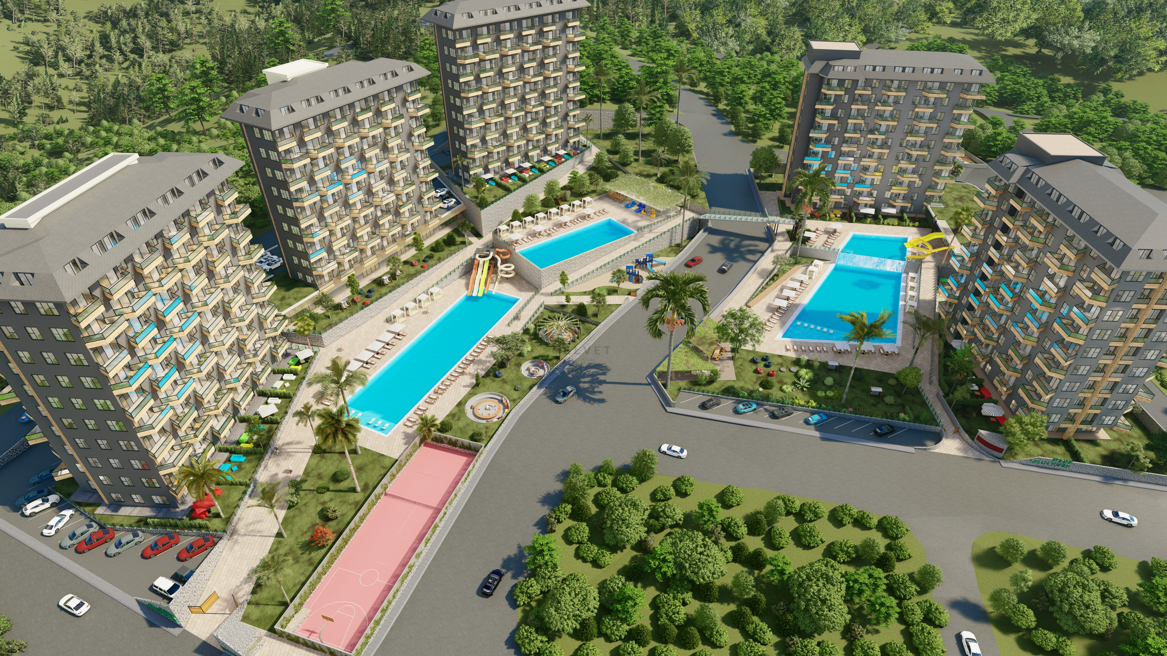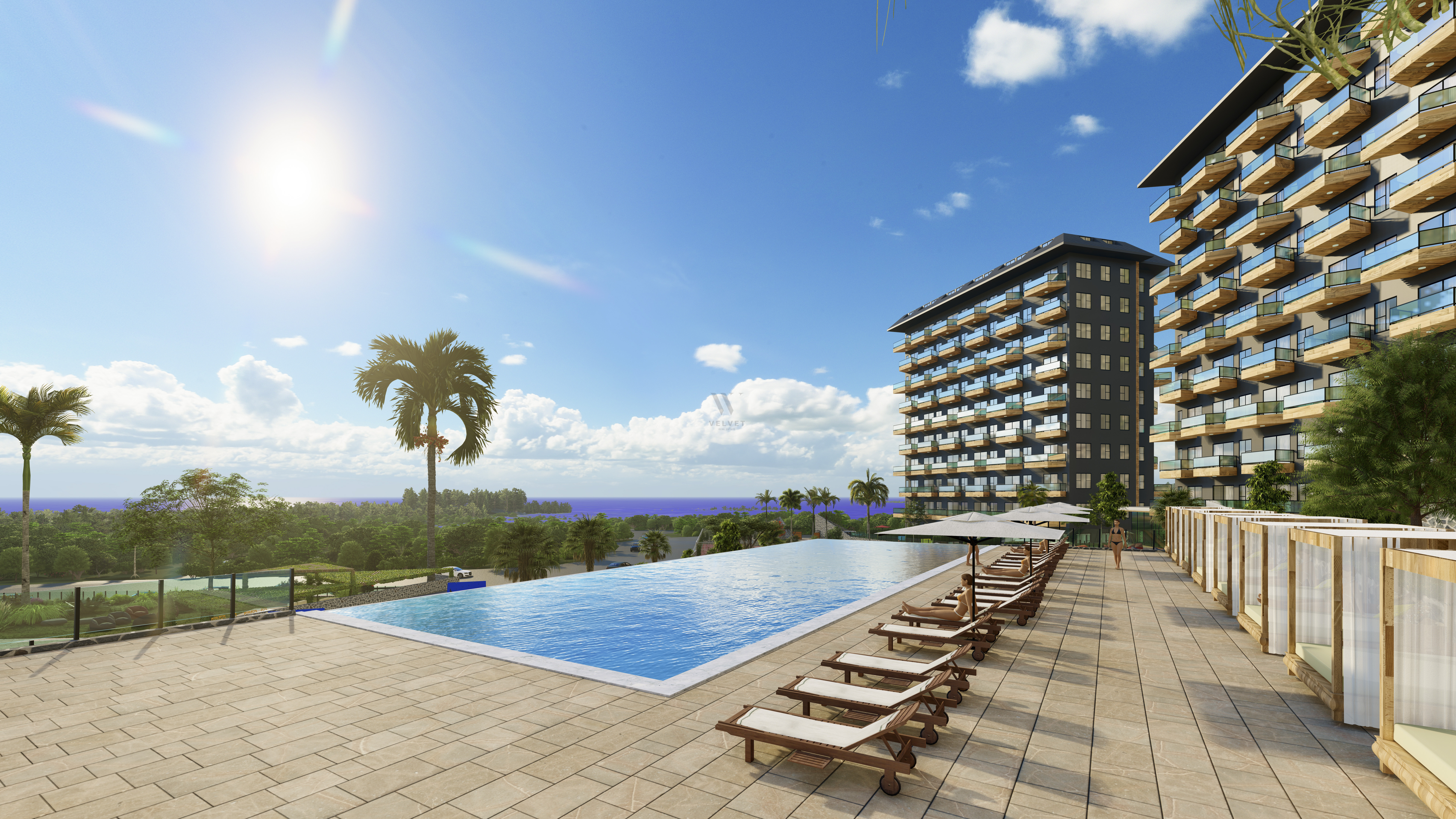 Жилой комплекс строится на участке площадью 7700 м2 и состоит из пяти блоков. Панорамные окна открывают великолепный вид на горы, море и зеленые насаждения.