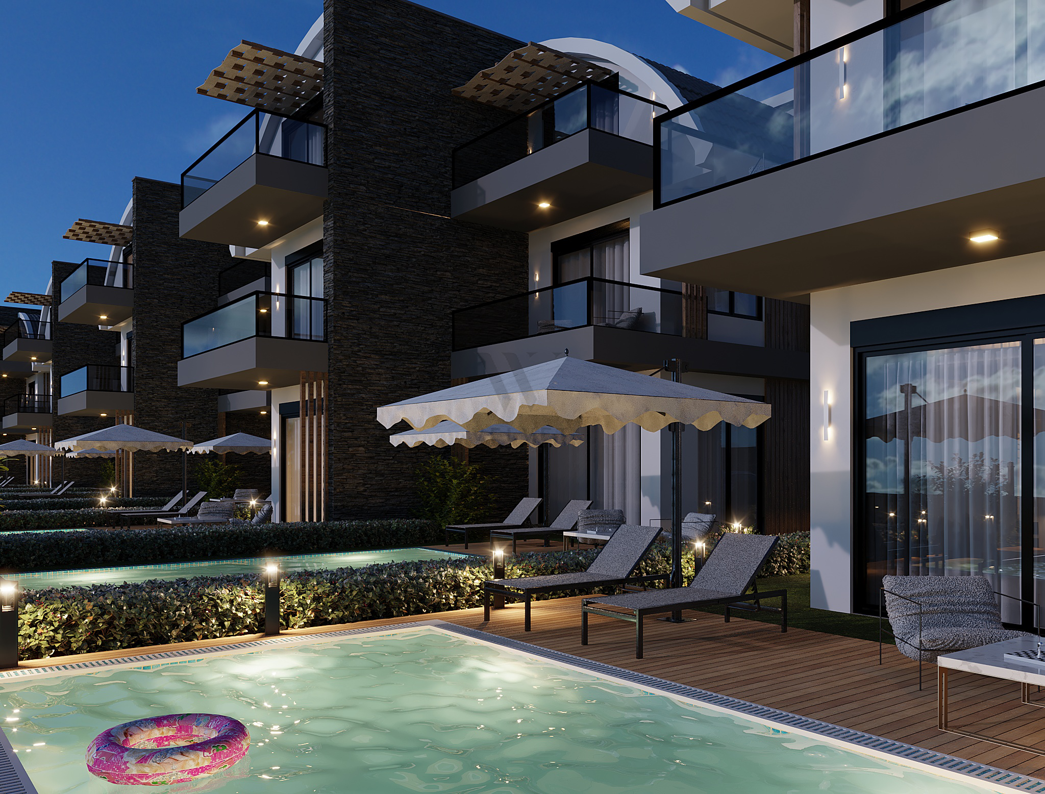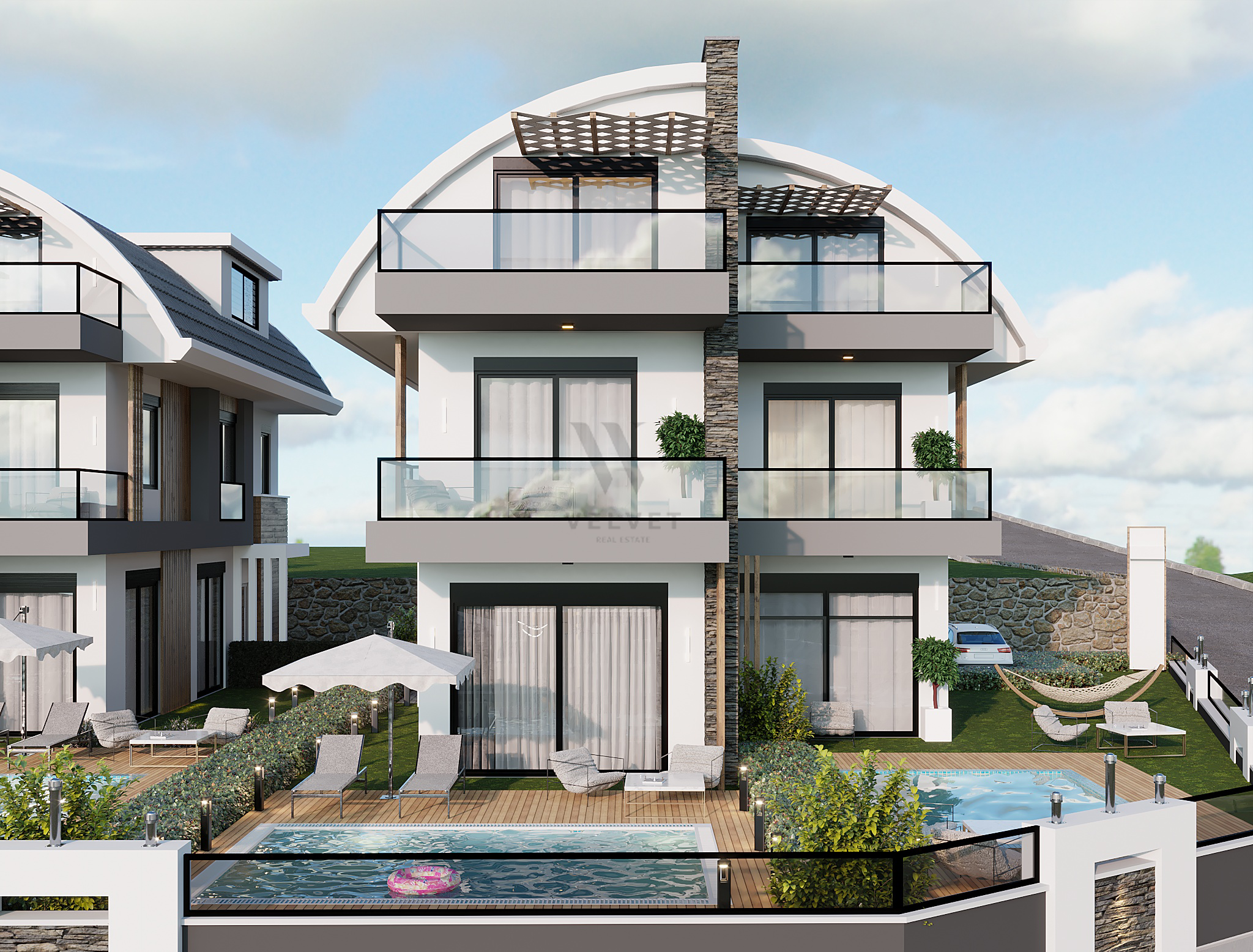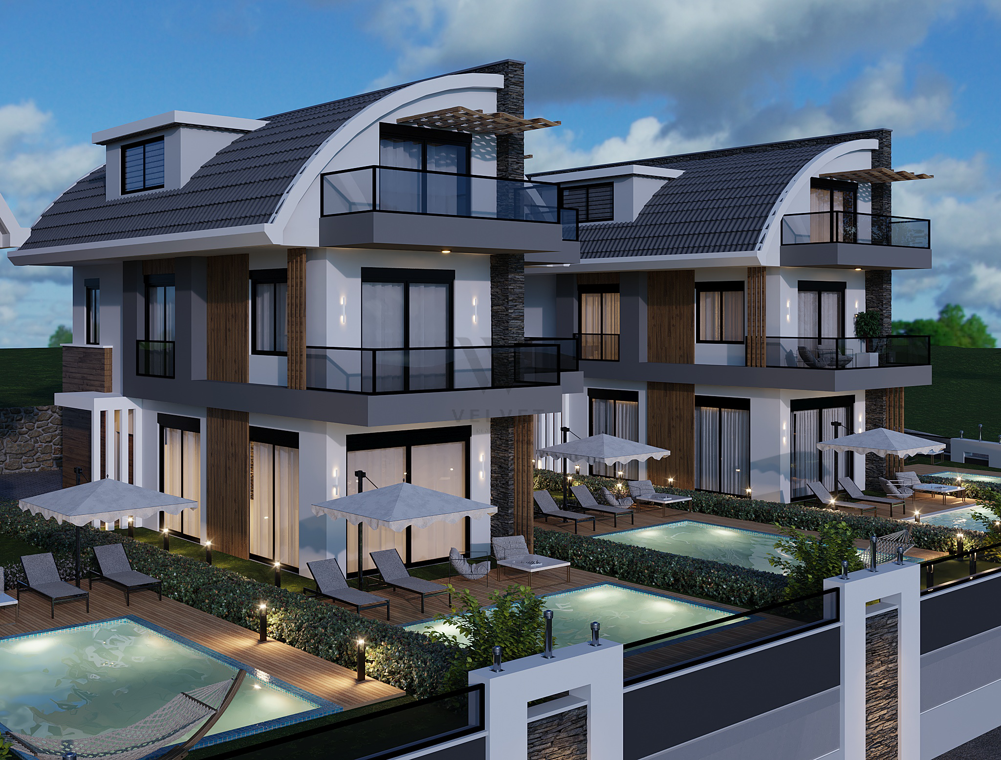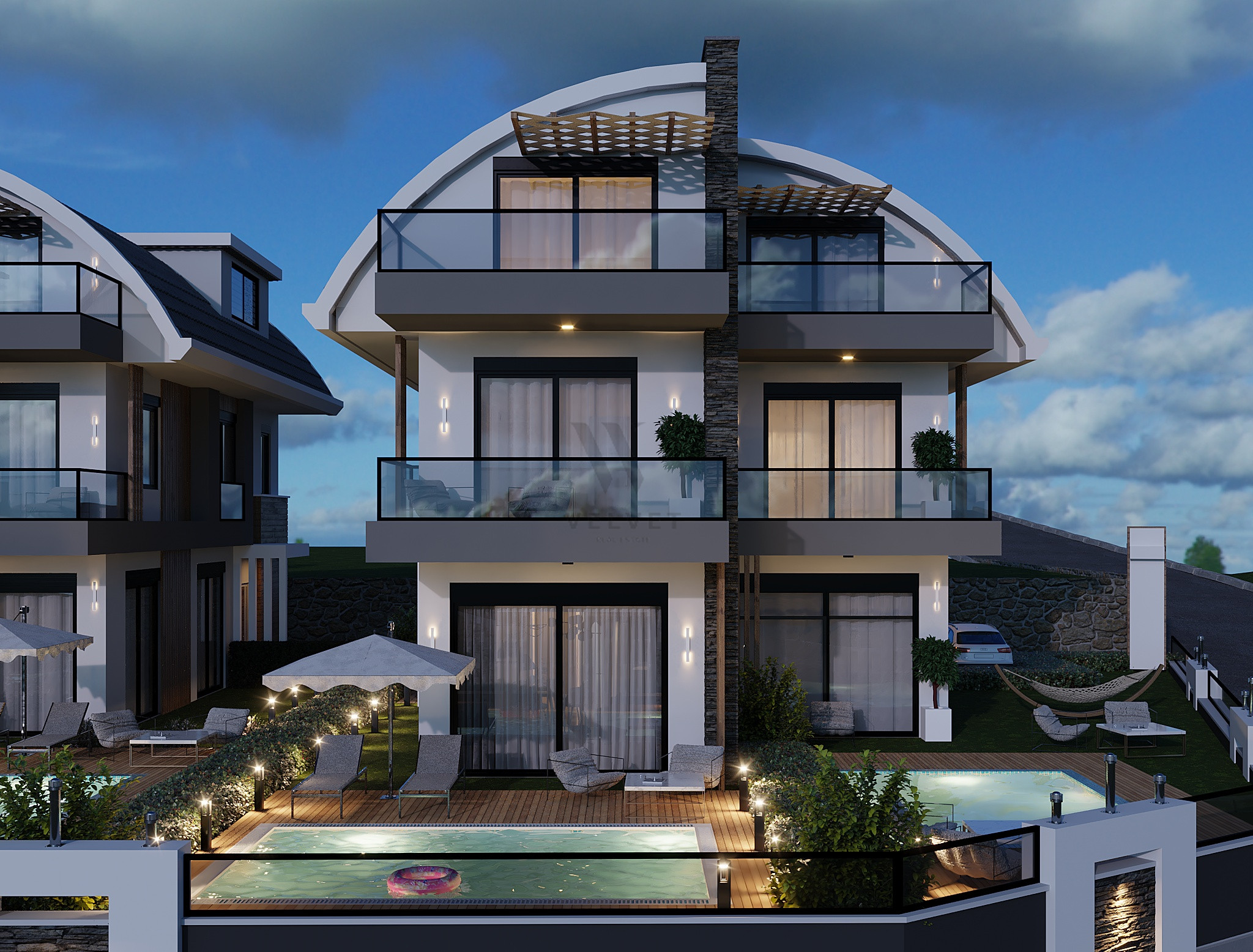 Вещи, которые нужно сделать на сайте: отдельный бассейн и сад, джакузи у бассейна, детский бассейн, садовый пейзаж, открытый паркинг, автоматические дверные проемы, электрические жалюзи, синергетические цветные стекла, бальзам, ЭНЕРГИЯ. ДЕРЕВО И МРАМОР И ЛЕСТНИЦА БУДУТ СВЕТОДИОДНЫМИ, ГЕНЕРАТОР.